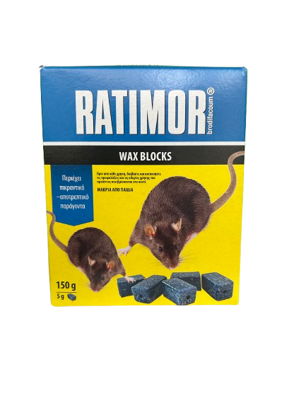 RATIMOR BB is in waxy cube form with a hole for fixing or tying and convenience for rodent control. Contains a bittering agent. The advanced composition of the baits, rich in fats and with strong aromas, makes them very attractive to rodents even in cases where alternative food sources are available. Its great attractiveness leads to increased consumption by rodents resulting in their exhaustion in a short period of time.